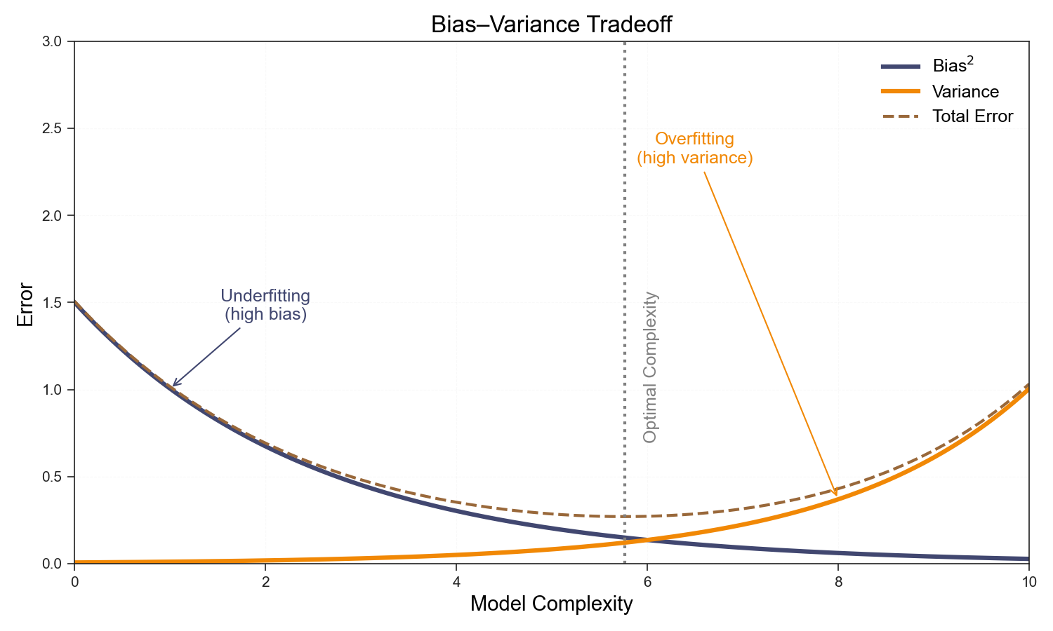 - Irreducible error (\(\sigma^2\)) is the noise inherent in the data generation process, which cannot be reduced by any model.